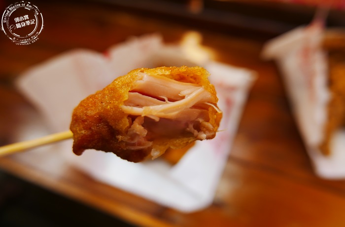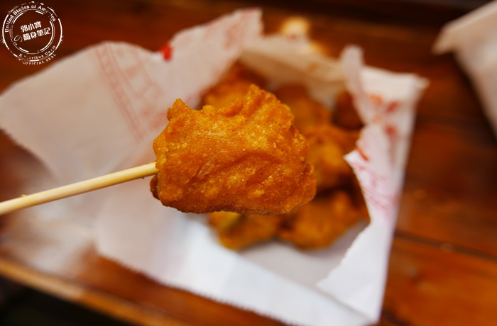 | 這散打機跟剛剛的三角骨外皮不一樣,散打雞感覺是用一層薄薄的麵糊把塊狀雞腿肉整個包覆著的感覺,看起來又有點類似豆乳雞,這種就可以直接用叉子拿起來吃,不用再徒手下去抓了,不然手都起水泡了,但還是要小心燙因為畢竟是剛炸出來的。 |