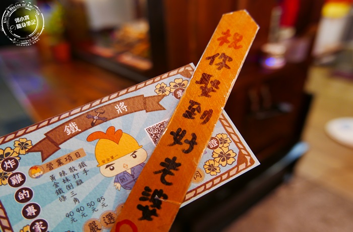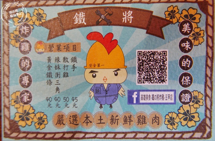 | 這是店家的名片,也是非常的可愛又很有一種懷舊的趣味感,上面的那隻雞可是店家的招牌,真像個穿工作服的吉祥物,名片上就直接有印菜單了,他們家很簡單就四樣,散打雞是招牌,辣妹倒三角是三角骨,鐵手是棒棒腿,黃金鐵條則是薯條,每種部位的名稱是不是都很有創意,為了要迎合店家的店名所取出來的。 |