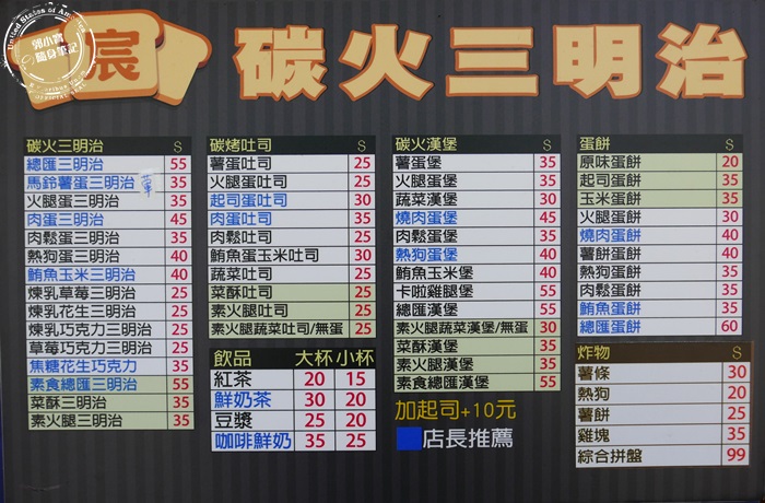| 菜單種類算是滿多的,除了一般早餐店常看到的蛋餅跟炸物之外,最重要的吐司、三明治還有漢堡,都是使用炭火烘烤製成的,藍色字的那個是店家比較熱賣的餐點,他們家也有素食的,如果覺得口味還不夠豐富,想要隨個人喜好加料變化也行,只要老闆娘做得出來都不是問題,但千萬不要太為難老闆娘。 |