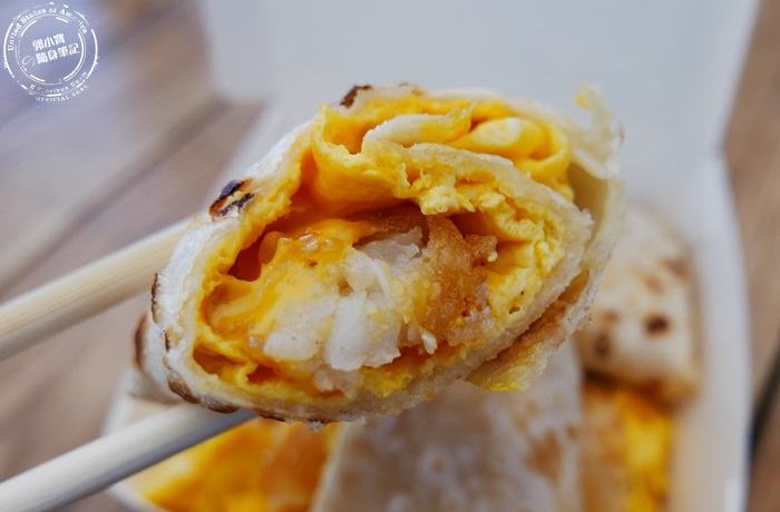 | 北邊超愛吃薯餅也超愛吃蛋餅,所以這兩種結合起來超對北編的胃,他們家的蛋餅皮好像也是表皮用烘烤的,沒有很油膩的感覺,有酥香感但是不是到很脆,蛋餅皮吃起來很Q很香,裡頭的蛋液黃澄澄的,蛋香十足而且很濕潤,炸得酥脆的薯餅,放在裡面並不會流失掉他原本的脆感,一樣很酥脆鹹香,裡頭的馬鈴薯很軟綿,馬鈴薯的香氣立刻讓食欲大增,再加上起司香濃綿滑,單吃原味就很有味道了。 |