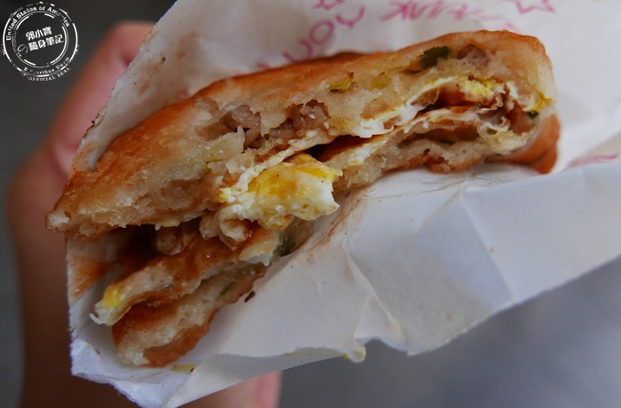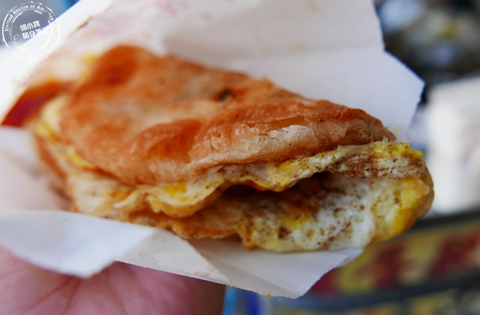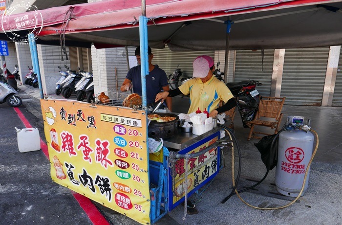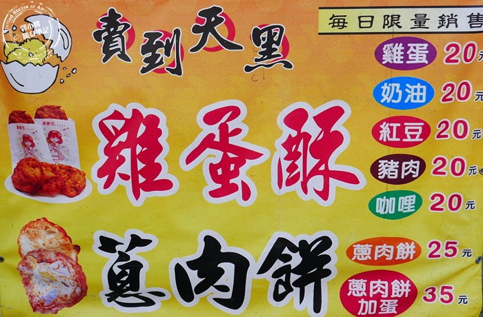 | 攤子上就大大的布條,菜單全寫在上面,雞蛋酥有分五種口味,蔥肉餅就原味跟加蛋兩種,都是銅板價,所以想要一次點很多也不會太傷荷包,重點雞蛋酥這個東西非常的古早,也很少見到,所以當然要立馬來嚐嚐囉! |