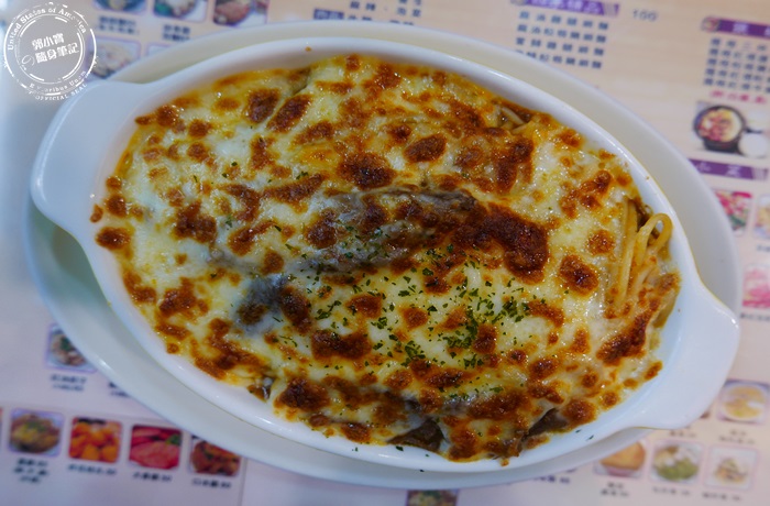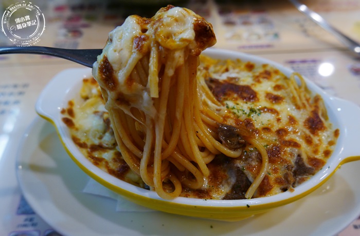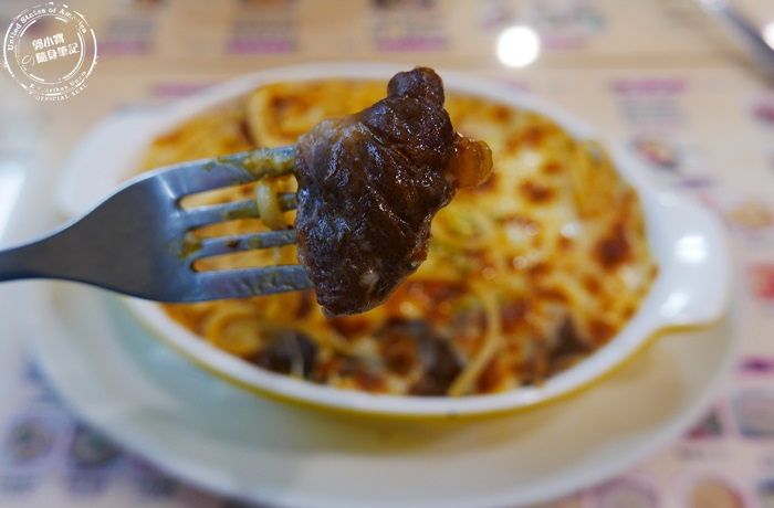 裡面的牛肉是牛肉片,有大有小,而且是有厚度也有醃過的牛肉片,咀嚼起來牛肉香氣很香,味道非常的鮮甜,有肉的紮實感很有咬勁,但是不會太硬不會不好咬,重點跟茄汁非常搭,整體跟麵吃起來超像在吃夜市牛排的,夜市的平價牛排的牛肉會比較薄,而且又因為是茄汁的關係,所以吃起來真的有點像在吃夜市牛排的感覺,只是麵換成義大利麵,然後多了焗烤的起司香濃,但北邊覺得很好吃,雖然不是很道地的異國風味,但是是非常合台灣人胃口的,重點這樣一大盤平價又超值,小鳥胃的女孩兒可能還吃不完。