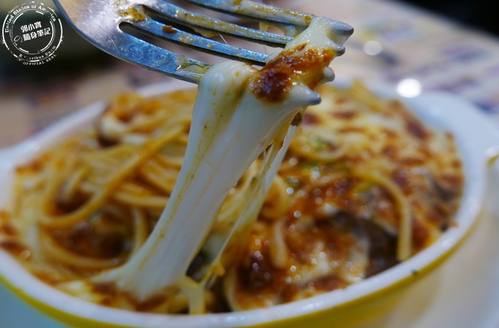| 店家ㄧ送餐上來北編就感受到那厚厚的一層起司,店家給料沒有再手軟,也不會想要節省成本就把起司減量,他們是鋪滿乳酪絲下去烘烤,滿滿的起司熱騰騰的超爽,一拉起來麵跟起司一起,一入口鹹香夠味,先是感受到濃濃的起司香撲鼻而來,再來義大利麵條的部分,他們家的是屬於偏軟一點的,但一樣有Q彈口感,店家使用的醬料是茄汁,麵條都有入味,一大口吸麵條除了保水度夠,整個酸甜味十足,又香又滑,瞬間胃口大開,而且這份量絕對可以吃的很飽足。 |