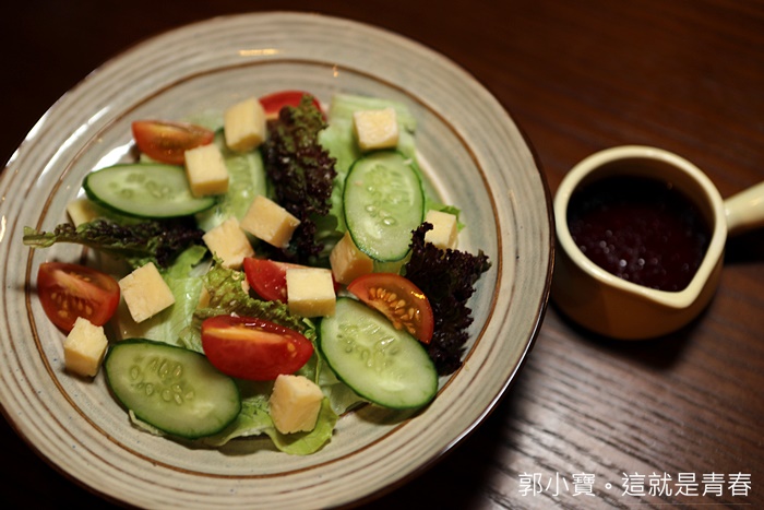 | 湯品是奶油洋蔥濃湯,還算滿不錯的,沾著搭配的麵包非常討喜,濃湯的份量也頗大,但看起來似乎是要讓客人沾著麵包吃得為主,沙拉的部分感覺起來還滿粗曠的,跟一般的沙拉感覺不太一樣,兩人份的沙拉盤連起司塊都給的很豪氣。 |