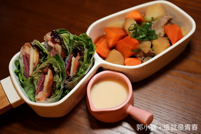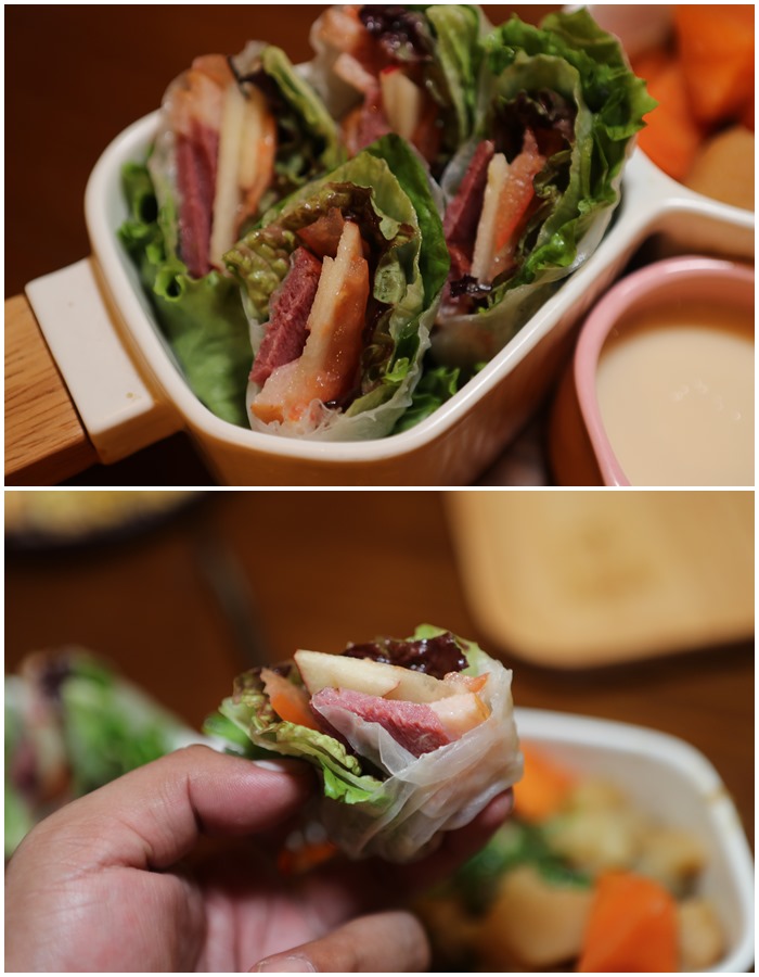 | 這櫻桃鴨春捲還滿特別的,單吃的話非常爽口,櫻桃鴨胸的煙燻味道還滿重的,搭配蔬菜一起入口水份非常多,咀嚼起來很順口以外,還有春捲皮是比較有彈性類似水晶餃的皮,整體的風味讓我覺得很有特色,沾醬吃也很好吃。 |