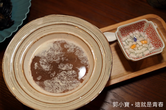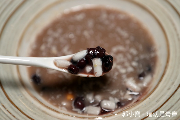 | 上來的時候我真的有驚呼了一聲,這紅豆湯圓也很特別,盤飾也很漂亮,旁邊的小方盤裡面放的是有點像是小湯圓的東西,加進去後吃起來的口感非常的豐富,而且不死甜很好喝!! |