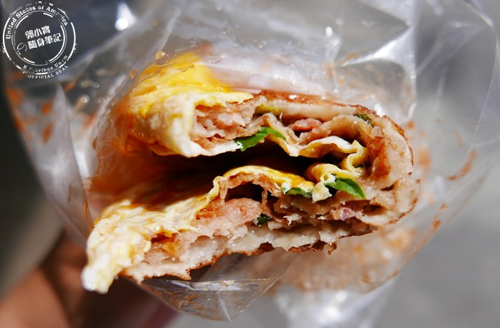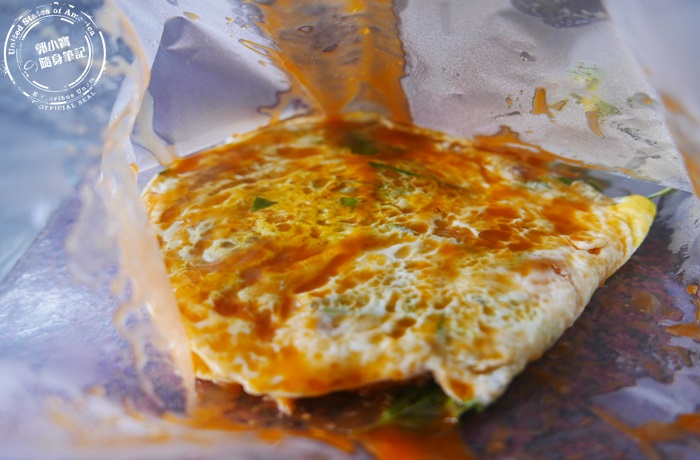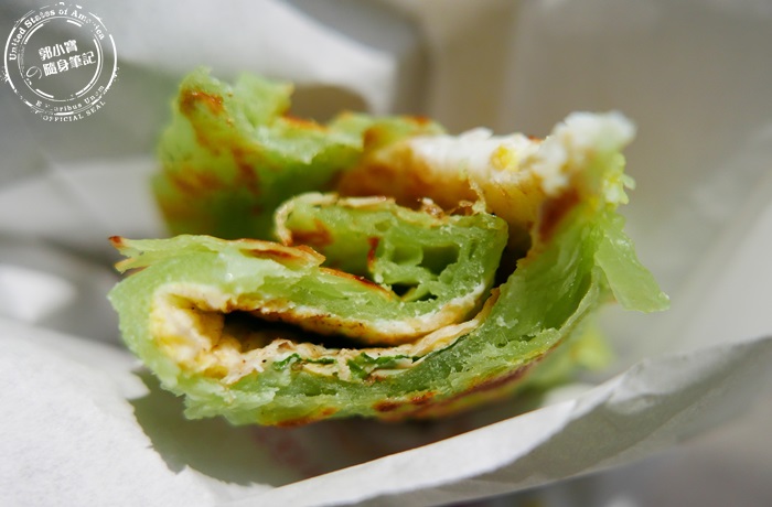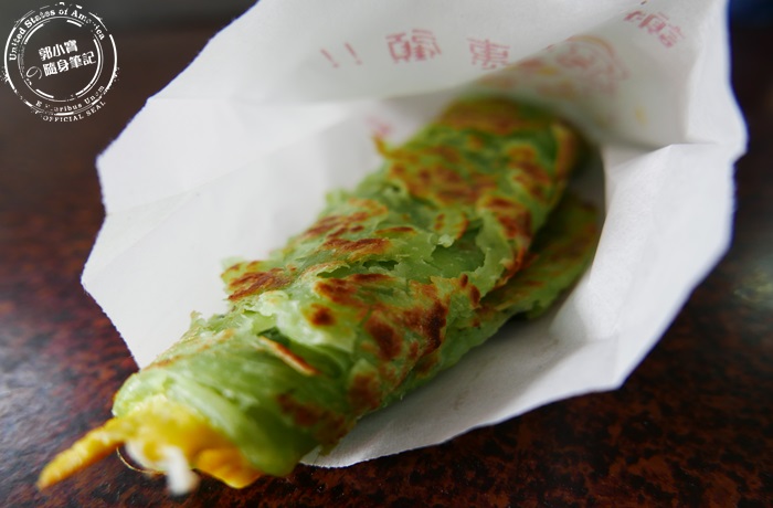 他們家的抓餅是綠色的,這是純天然的菠菜口味,但其實吃起來沒有菠菜的草青味,應該是說沒有什麼菜味,雖然是抓餅,但感覺像是直接下鍋煎而已,少了抓跟拍打的動作,導致這個抓餅沒有那麼的酥鬆柔軟,反而是比較有Q度嚼勁,有厚度比較紮實感,外表煎得微焦脆,還是能感覺到最外層的酥香,還有蛋香跟九層塔的濃郁香氣,老闆娘只是灑胡椒粉而已,所以單吃起來其實有味道但是會太乾,可以請老闆娘加醬油膏或是辣醬,增加濕潤感跟甜味,這樣一來香氣會更棒更迷人,變得比較好吃。