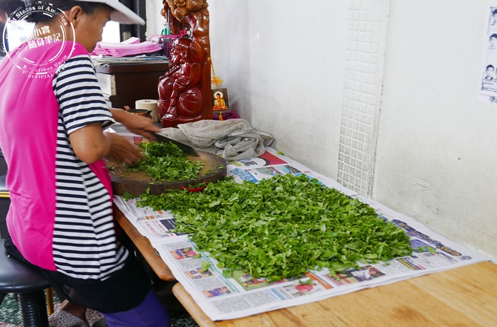 | 進到店裡左手邊牆角的位子,店裡的阿姨正在忙著處理大量的香菜,空氣中瀰漫著濃濃的香菜味,由於是密閉空間,空調電扇不斷在吹,這香菜味道之濃郁啊!喜愛香菜的看到這一幕應該會瘋狂吧! |