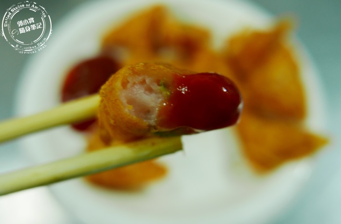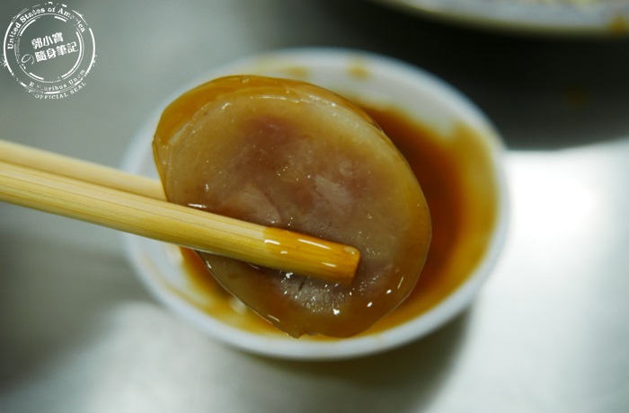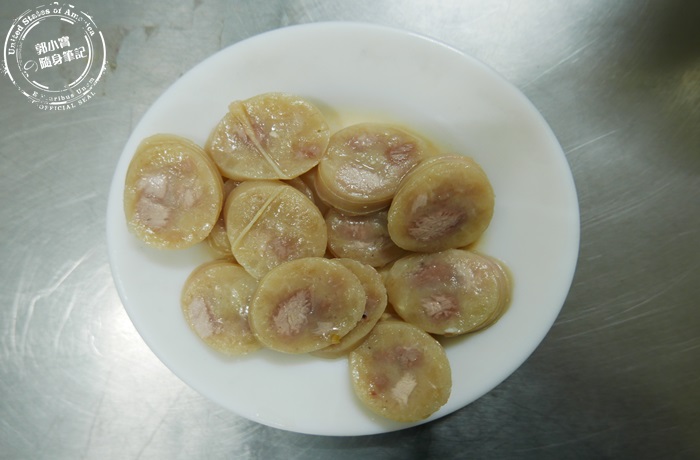 這個好像也叫粉腸,是再加工製造的,腸衣裡灌入瘦肉及地瓜粉調成的粉漿,再經過水煮的一種食物,吃起來軟軟QQ的,外皮的腸衣很薄脆,裡頭的塊狀瘦肉又很有嚼勁,吃起來口感層次很豐富,因為是水煮燙過的,比較沒什麼味道,一定要靠沾醬增添風味。