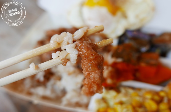 | 根本超澎湃的這便當,主角當然是那兩顆荷包蛋,沒錯是兩顆,只是店家把他合而為一了,荷包蛋超大,完全佔了一半的面積,連飯都被覆蓋了,把飯拿開下面更是厲害,鋪滿滷的豬肉絲耶,看到口水直流唷,旁邊的配菜就看自己喜歡吃什麼夾什麼,就是在便當店很常看到的菜色,沒有太特別,只是他們家菜色有20樣左右,超多的。 |