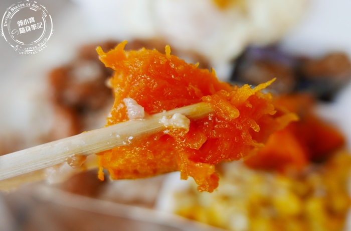 | 配菜的南瓜切的蠻大塊的,連皮一起下去燉煮,所以每塊南瓜都超完整的,南瓜味道很香吃起來很綿密,還看得到南瓜的纖維一絲一絲的,入口即化而且非常的甜,味道很棒。 |