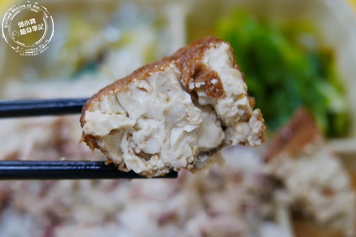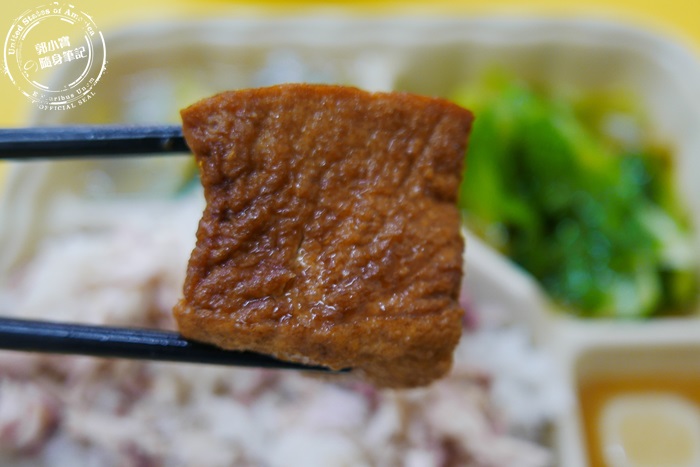 | 咬開後的油豆腐,氣孔沒有很大,但是一樣吸了很多滷汁,一口咬下的鹹香濕潤豆香氣濃郁,非常的軟綿夠味,吃火雞肉飯的基本配備滷菜,這個便當裡面通通都有,超級划算超級方便的。 |