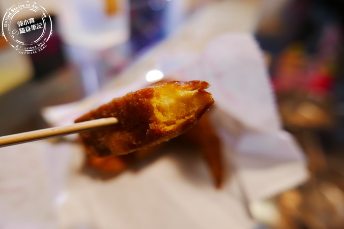 | 這個流沙包造型真的很特別,外表看起來真的像一朵香菇一樣,一口咬下是沒有到流沙包那樣會爆漿的口感,裡頭包的是黑芝麻,黑芝麻的香甜味綿滑柔順,外衣吃起來就是銀絲捲,炸過之後外表非常的酥脆,跟銀絲捲的口感很像,只是沒有一絲一絲的,不過很香很好吃,外表也很討喜,可以買來惡整一下朋友,讓朋友以為是炸香菇沒想到吃起來是甜的,這個很特別。 |