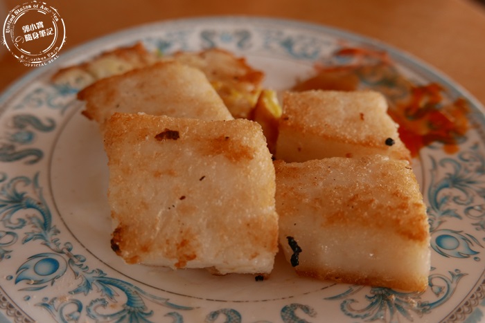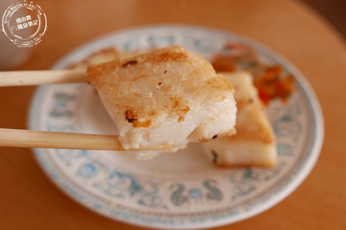 老闆娘說她們家的蘿蔔糕是自己做的,於是就點來吃吃看,一份是兩塊,如果覺得吃不下太多,也可以只點一塊嚐嚐味道,艾編覺得她們家的蘿蔔糕就是自製的米漿蘿蔔糕,完全吃純米的味道,因為艾編對蘿蔔糕很講究,所以覺得這個就是一般早餐店的蘿蔔糕,裡頭沒有添加什麼,直接下鍋煎的外表酥脆,香氣四溢,口感吃起來軟Q綿密,味道簡簡單單的,要沾醬吃才有味道,這蘿蔔糕完全是用料實在,台式蘿蔔糕就是吃原味純粹的美味,便宜又好吃。
