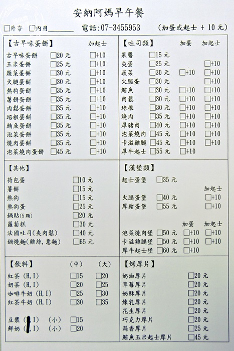 這家店給人的感覺不差,整整齊齊乾乾淨淨的,所有的餐點都是ㄚ媽打理的,但是ㄚ媽不叫安納唷!可能是ㄚ媽很喜歡回:安納(台語)吧!不過ㄚ媽蠻可愛的,其實我本來點的蛋餅是有選口味有要加料的,ㄚ媽的女兒也再三的叮嚀,但是可愛的ㄚ媽還是忘記了,沒關係,東西好吃就要吃原味的,他們家東西真的份量都偏大偏多,吃的飽又便宜,而且新鮮又衛生,吃的很安心,很適合學生跟上班族,有經過的朋友們,可以停下腳步來看看可愛的ㄚ媽唷!品嚐媽媽的味道。 |