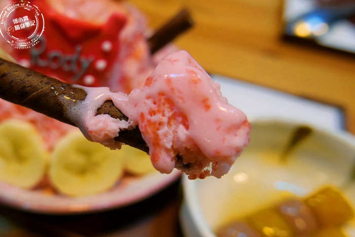 | 巧克力脆笛酥搭配酸甜的草莓牛奶雪花冰,酥脆香甜在嘴裡,豐富又滿足,光是一個雪花冰就放了3種餅乾搭配著吃,還有香蕉跟芋圓可以一起吃下肚,真的很超值的說,雪花冰大碗還有這些合拍的配料,口感上太有層次了,極為豐富,重點好吃又好拍。 |