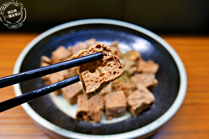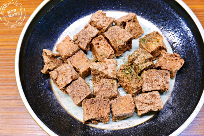 豆腐切小塊下去油炸,炸成一口大小酥酥脆脆,佐日式椒鹽就是前所未有的美味,還沒入口能感受到炸豆腐的香氣,入口先感受到外皮的酥脆與椒鹽香氣鹹味,再來才感受到裡頭豆腐本身的柔軟,越吃越唰嘴,超過癮的,艾編真的超喜歡的,完全停不了口呀!炸的油溫與時間拿捏的很好,使用的油也一定要是新鮮的,才不會有油耗味,他們家的就是這麼清新天然,口感酥脆清爽,配酒感覺很合適唷!