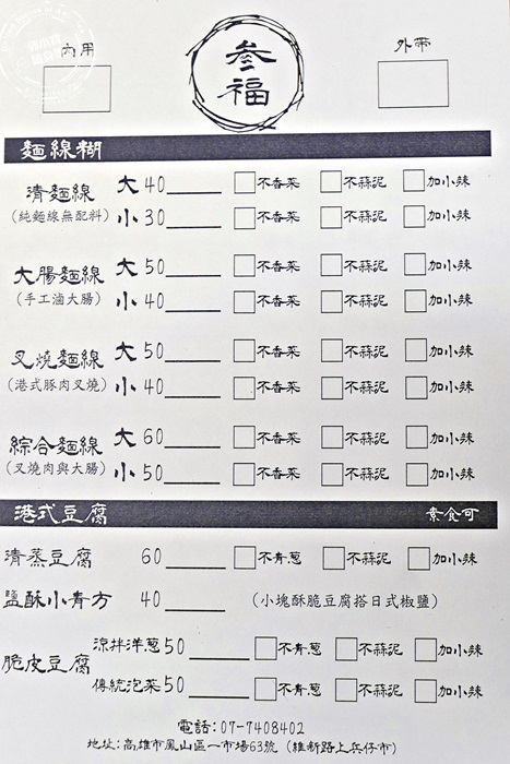| 菜單就是賣麵線糊跟港式豆腐,有原味的也有加配料的,麵線糊比較特別的是有加叉燒,豆腐部分有清蒸的,也有炸的,脆皮豆腐有搭配傳統泡菜的臭豆腐,還有比較特別的涼拌洋蔥下去做搭配,口味看上去好像都還不錯吃,價位也不貴,這麼平價的在地獨特小吃,沒來嚐嚐看肯定會很揪心的。 |