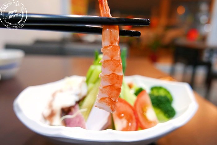 | 一盤沙拉裡頭有一隻已經去好殼的蝦,很方便吃,而且好新鮮,鮮蝦就是甜美,飽滿有彈性的肉質,在嘴裡釋放大海的鮮甜,冰涼舒服又爽口,最愛吃的就是這煮的剛剛好的鮮蝦。 |