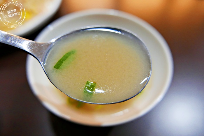 | 味噌湯雖然沒有什麼配料,但是能夠明顯感受到高湯使用鮭魚骨下去熬煮,所以最外層還帶有點鮭魚的油脂,香氣十足,搭配濃濃的味噌香氣,這湯喝起來相當的順口潤喉,簡單加點蔥花調味,味道喝起來就是鮮美甘甜,清爽好喝。 |