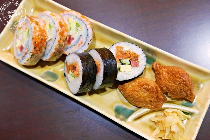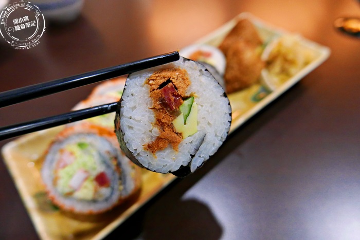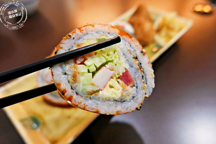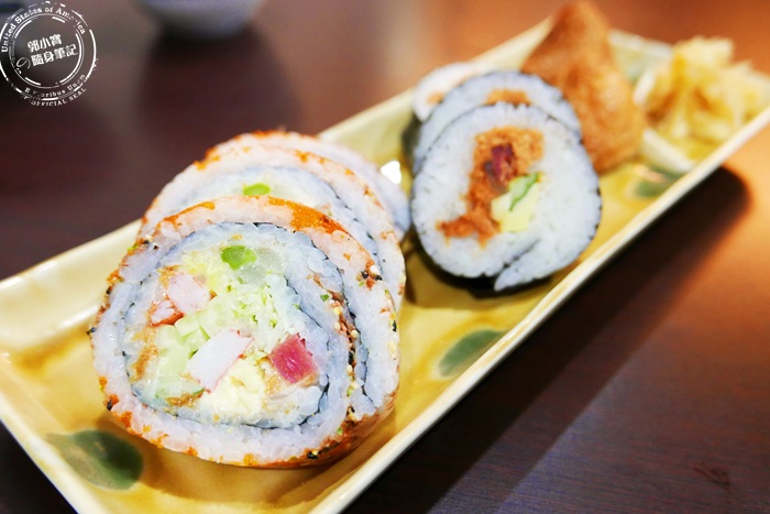 | 花捲壽司超大,裡頭包了滿滿的配料,最外層的壽司米加了蝦卵增添口感及色彩,不少日式料理店都一定會做的捲壽司,但他們家的真的蠻好吃的,除了份量實在之外,味道也很好,口感層次豐富,壽司醋飯香Q酸甜,蝦卵在嘴裡跳躍著,每一口都是繽紛的享受,大概一個吃完就差不多飽了。 |