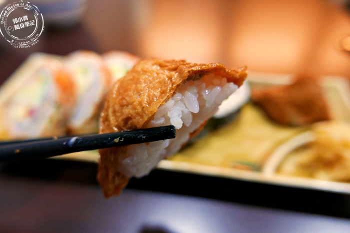 | 豆皮壽司,想講的假掰一點就是「稻荷壽司」;「稻荷」的「荷」字,可做「荷包」解,就是將豆皮做成荷包狀,包入米飯即為稻荷壽司,感覺就很吉祥又討喜,這最經典的豆皮壽司,是用油豆腐皮加上捏製小橢圓醋飯做出的可愛模樣,醋飯香Q柔軟,配上濕潤的豆皮,香氣十足,在嘴裡濕潤甘甜,味道極好,簡簡單單的美味,非這稻荷壽司莫屬了。 |