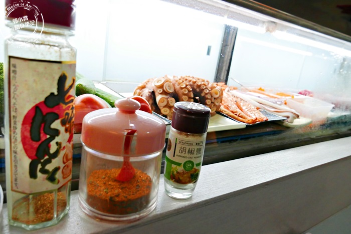 | 各式各樣的海鮮生魚片躺平在冷藏櫃裡,新鮮看的見,還有日式調味料可以自由取用,雖然艾編最後也是沒加,細心周到是這家店給艾編的最佳印象。 |