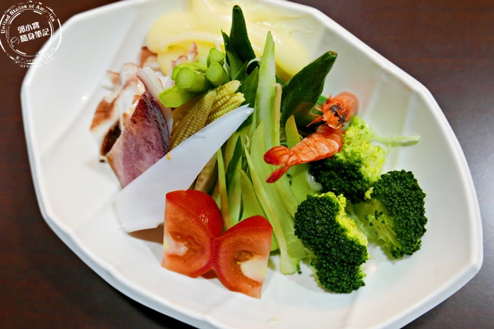 | 有大量的蔬菜,花椰菜、秋葵、芹菜、玉米筍、蘆筍、小黃瓜、番茄,川燙後冰鎮,口感新鮮爽脆,水潤的蔬菜清甜與天然的食材香氣,讓整份沙拉更多了清爽健康,可以自行決定要不要沾店家提供在一旁的美乃滋,怕熱量太高的話,吃些蔬菜海鮮就不怕發胖了。 |