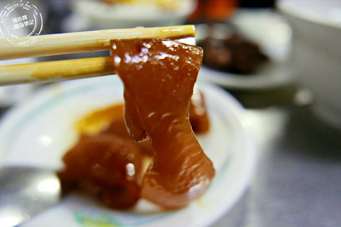 | 豬皮處理的很乾淨,表皮都看不不到毛,豬皮一樣滷的很入味,軟嫩鹹香Q度彈性微微的而已,不過在嘴裡的柔軟度與香氣相當舒服,補充滿滿的膠原蛋白就是要吃豬皮。 |