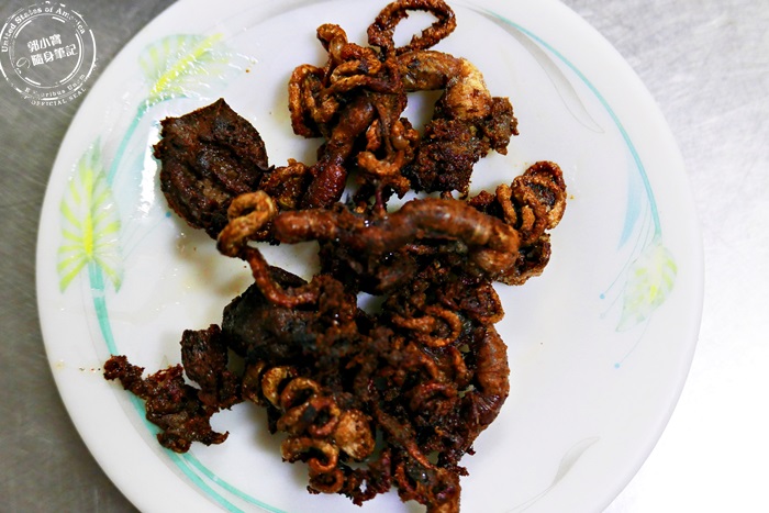| 魚腸可以選擇煮湯的或是乾煎的,因為以前媽媽都會買魚腸回家煎,所以看到菜單上這道時眼睛為之一亮,不點來吃怎麼行,可是上桌的時候焦黑狀嚇死寶寶了,不曉得是老闆娘煎過頭了,還是他原本就這樣子,跟媽媽的味道不一樣,雖然有點小失望,但是吃起來的焦香氣息充滿在口腔、鼻腔,還有魚腸的濃郁香氣,軟嫩酥脆的口感,越嚼越香,應該老一輩的,尤其是男生,會很愛這一味唷! |