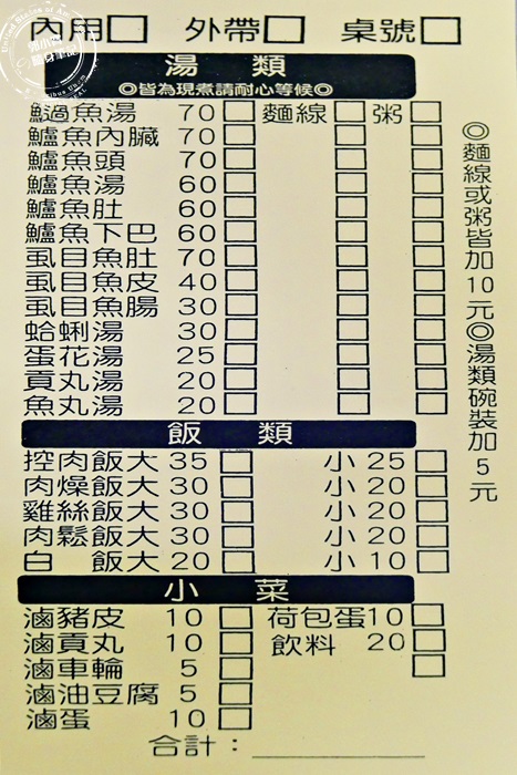 | 他們家雖然很老派的感覺,以為直接口頭點餐就好了,殊不知還要填菜單唷!不管人多人少都要填唷!菜單湯類的部分佔大半,有𩼣魚、鱸魚、虱目魚,可以點湯或是麵線跟粥,要加10元,欄位都標示的蠻清楚的,飯類也蠻多種可以選擇的,,還有小菜類的,道道都是經典好味道,滿足每個客人的需求,這些小吃,當宵夜或是正餐都很OK,想墊墊胃的,來這裡也能便宜飽餐一頓,如果是自己或是小朋友生病,直接來上一碗熱熱的魚湯,補充元氣是不是很方便快速,在這裡屹立不搖那麼長時間,絕對有兩把刷子。 |