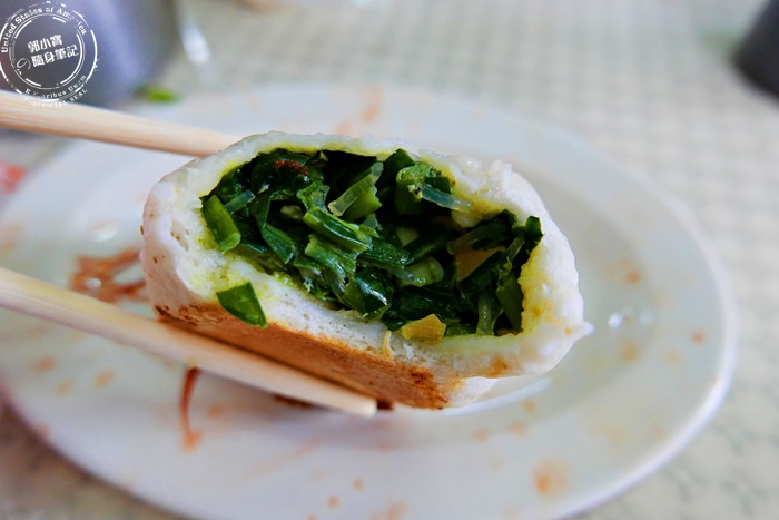 裡頭炸開來的韭菜,滿滿的韭菜香氣撲鼻而來,他們內餡的韭菜切的很粗獷,所以口感很好,吃的到韭菜的自然鮮甜,再搭配冬粉絲吸飽飽的精華,軟嫩感十足韭菜濕潤爽脆,濃濃的韭菜味在嘴裡久久不能散去,愛慘了這味道,外皮的部分也很加分,柔軟香甜還帶有麵筋的韌性,Q彈光滑香氣四溢,這霸氣的韭菜煎包便宜又實在的美味呀。