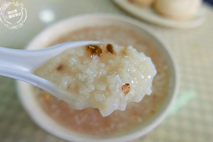 | 這綠豆粥其實小米粥蠻類似的,原味沒有味道,要自己加糖調適合自己的甜度,不一樣的是他是用白米加綠豆下去煮,起初艾編以為的綠豆粥是像綠豆蒜這樣,結果不是,口感就是像番薯籤粥,只是地瓜改成綠豆,綠豆香氣微微淡淡的而已,蠻另類的古早味,還不錯吃。 |