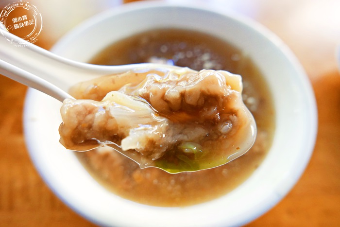 | 焿的部分很清爽,單純醃過的豬肉下去裹粉而已,直接吃到豬肉的原汁原味,滑嫩柔軟,輕輕一抿不需費力就化開在嘴裡了,豬肉新鮮,肉質的彈性還是保有的,吃起來的味道很鮮甜,香氣味道都是很舒服的,沒有豬腥味或是不舒服的味道,而且肉焿給超多豬肉的,艾編超級無敵愛這肉焿,相當好吃相當的討喜。 |