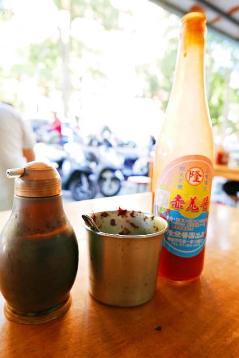 桌上一定會有的調味料,雖然艾編沒有食用到,但還是拍給大家看看,看看他們的醬料多麼的古早味,尤其是那個辣椒醬,可能都還不知道哪裡可以買到說,也有辣椒油的部分,想要辣椒味道重一點的就加辣油,烏醋也是喝焿湯必備的,提升風味更開胃。