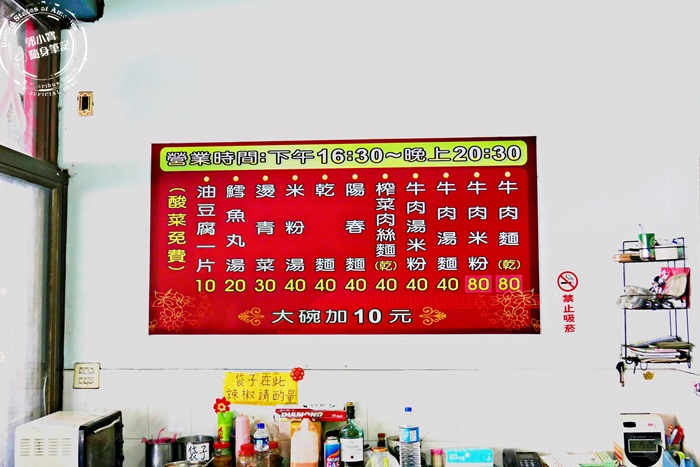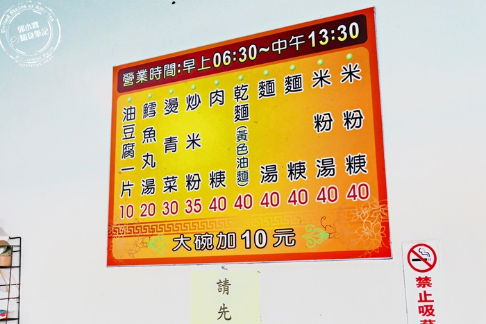 | 菜單有兩份,分別掛在兩面牆上,一面是早上時段部分,焿湯麵類的,下午沒有焿,只有麵、米粉跟牛肉麵的部分,供應的略有不同,相同的是價格蠻平價的,而且大碗只要加10元,如果是食量超大的客人,真的建議可以加大,因為他們家的大小碗份量差的有夠多,大碗的根本是碗公裝,整個好超值,艾編怕吃不完,還是點小碗的就好。 |