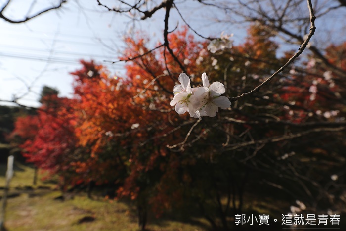 | 這邊秋天的時候還有一個很隱藏版的美景,就是可以同時看到櫻花跟楓葉交錯,這邊有冬櫻在秋天會盛開,旁邊就是楓葉,這樣交錯的美景我第一次看到,好夢幻!! |