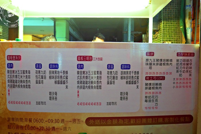 | 菜單直接掛在攤子上,有鐵板堡系列、鐵板三明治系列、蛋餅、烤吐司、古早味飲品,比較特別的是鐵板系列,可以選肉、選蛋、選調味料,隨意做搭配,不需要每次來都吃一樣的,自己選擇做出想要吃的,這麼替客人著想的服務,實在太貼心了,價格也不高,深受學生的愛戴呀!隨時能吃飽,而且很方便吃唷! |