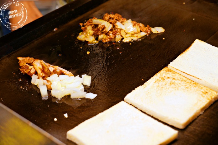 | 點完餐老闆就會直接製作,因為是現點現做的所以需要等候一點時間,看著在鐵板滋滋作響的食材,還有那烤的有點酥香的吐司,太可口太誘人了,老闆一邊在煎,一邊冒出的香氣,在一旁等候的艾編是越來越餓呀! |