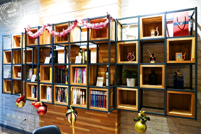 | 牆上的裝潢很壯觀呀!這一格格的方形置物櫃,擺了很多書跟裝飾品,這面牆光是用看的,就讓人覺得舒服,在這麼牆拍照上傳,人人都是網美呀!超吸睛的,文青元素必備呀! |