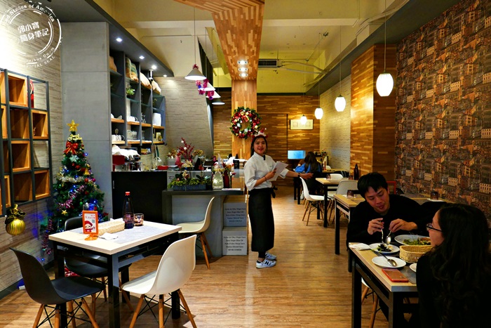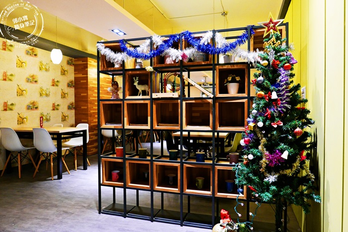 | 一走上來一樣有個大書櫃,像是一面牆一樣,讓用餐環境多了點隱密性,因為是聖誕節的月份,所以有聖誕樹的裝飾,二樓的空間一樣讓人覺得溫馨舒適,坐樓上樓下都很棒。 |
