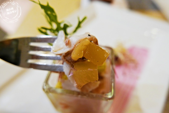 | 涼拌的豬肉鳳梨洋蔥番茄丁,豐富有層次,味道清爽開胃,可以沾店家特製在底部的紫高麗菜美乃滋一起吃,味道更溫和香甜滑順,前菜來的好開胃呀!有蔬菜水果這樣吃,自然的脆甜口感讓人好滿足唷! |
