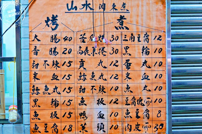| 牆上有菜單,很少看到這種黑輪、關東煮的有菜單寫價格的,所有價錢寫的清清楚楚,完全不怕被亂算錢,也不會吃超出預期,菜單上的字體寫的也太美,濃濃的古早味呀!銅板價的台式關東煮,絕對是冬天裡暖心暖胃的最佳選擇。 |