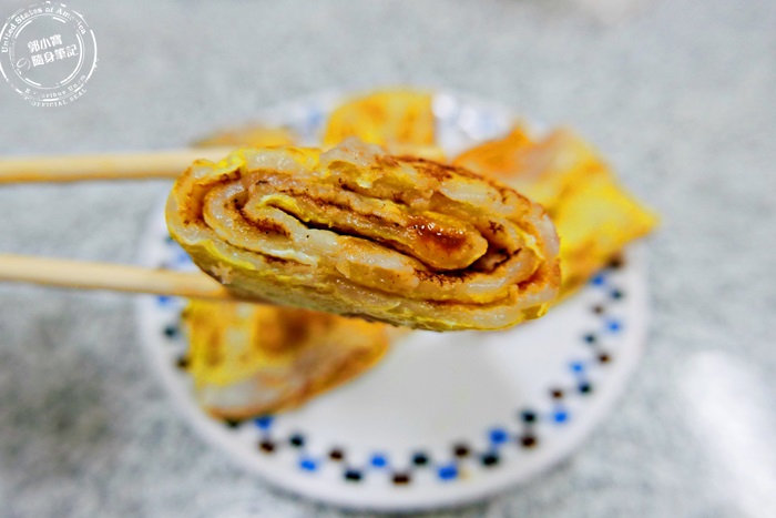 這種粉漿蛋餅非常的有魅力呀!雖然他們家的粉漿蛋餅沒有弄得很厚,但是這樣捲起來也是超有厚度的,層層堆疊的口感超好,軟Q香氣十足,配上蛋香,滋味純粹的好吃呀!外圍煎的微酥脆,雖然不是用古早味的蔥蛋,整體吃起來還是很棒,加上辣椒醬,真的會辣唷!香氣十足,不敢吃辣的朋友可別輕易嘗試唷!晚上睡不著可以吃到這熱騰騰的古早味蛋餅,實在太滿足啦!