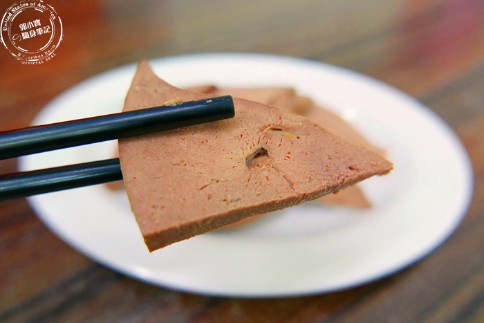 | 因為菜單上有個打星號的推薦,所以艾編就點來吃吃看,真的很特別,他是豬肝下去切片,冰冰涼涼的,口感不像吃豬肝那種軟嫩脆彈的,而是比較緊實有嚼勁,粉嫩嫩的好咀嚼,重點有濃濃的高粱酒香,調味剛剛好,鹹香唰嘴,真的蠻好吃的也好特別,豬肝又大片給的量又多。 |
