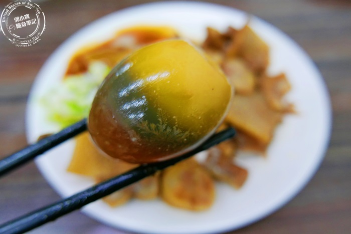皮蛋就這樣整顆上桌,也沒有切,整顆拿起來啃好霸氣喔!皮蛋這東西就見仁見智了,他的氣味可能有些人會不敢吃,艾編是還蠻喜歡的,尤其蛋黃濃稠的滋味,滑順口感,蛋白部分很有彈性,直接沾醬油膏有點味道就很美味,滷菜裡加顆皮蛋也不錯唷!不一定每次都要配滷蛋。