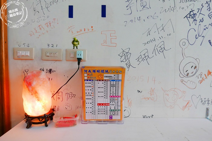 | 還沒有到裡面的內用座位區,走道的右手邊就會看到這面塗鴉牆,放上鹽燈的桌面這裡有菜單,這是麵店嗎?竟然還有放鹽燈做裝飾,整個氣場完全不一樣,記得自己拿了菜單之後再去找位子坐唷! |