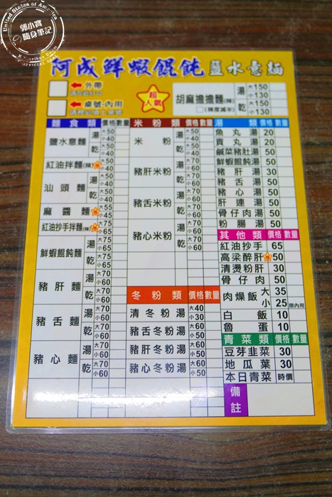 | 菜單的部分就是各種麵類,各種米粉、冬粉,湯類還有其他的單點菜色跟青菜,價位其實蠻平價的,而且選擇多,還有貼心的分大小碗,可以依照自己的食量選擇,非常大張的菜單欄位也標示的很清楚,就算是比較年長的長輩來點餐都可以看得一清二楚。 |