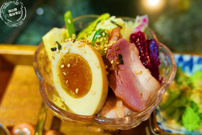 | 定食的部分有附兩小菜,這一碗妝點豐富又吸睛的生菜沙拉,生菜的部分非常的新鮮爽脆,加上調味的醬汁很清爽酸的很開胃,還有鴨片肉增加香氣口感,咀嚼中釋放的鹹味跟鴨油,太軟嫩太好吃了,另一個會讓人驚艷的是糖心蛋,淡淡的甘甜氣味跟蛋黃的半熟滑嫩的口感,纏綿在嘴裡好舒服的呀!糖心蛋就是很中大家的胃。 |