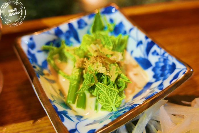 | 另一個小菜是胡麻醬龍鬚菜,一樣是冷食,龍鬚菜的爽脆加上胡麻醬的微酸口感,香氣撲鼻,份量才一點點很快就吃完了,清爽的很適合當開胃菜。 |